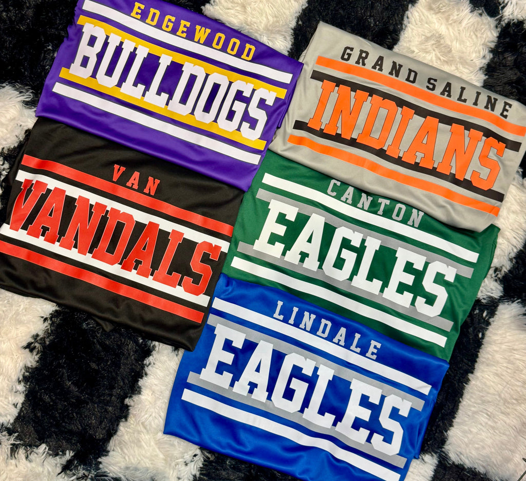 During checkout: Please Leave: Town Name // Mascot Name // Primary and Secondary Colors.
