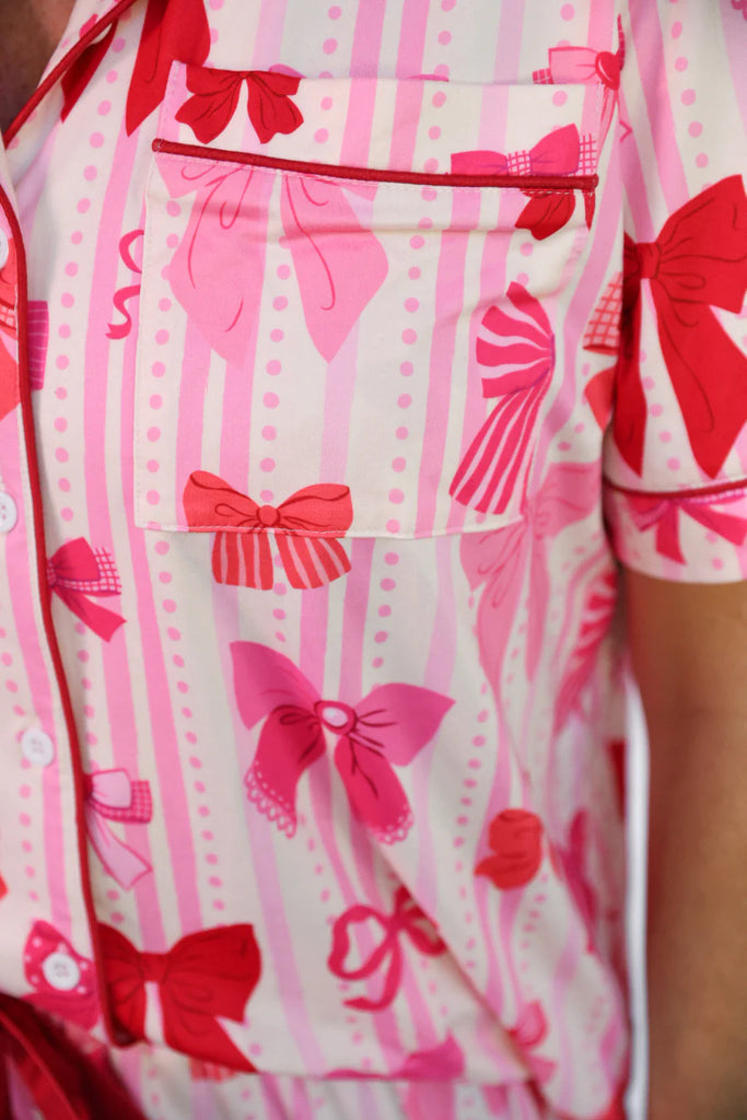 The Bow Romance Ruffle Pajama Set combines adorable charm with stylish details. Featuring lively red and pink bows, delicate pink stripes, and dotted accents, it’s finished with a striking red tie and ruffled pants. Elevate your sleepwear with this cozy, fun set that promises comfort and a touch of playful elegance.